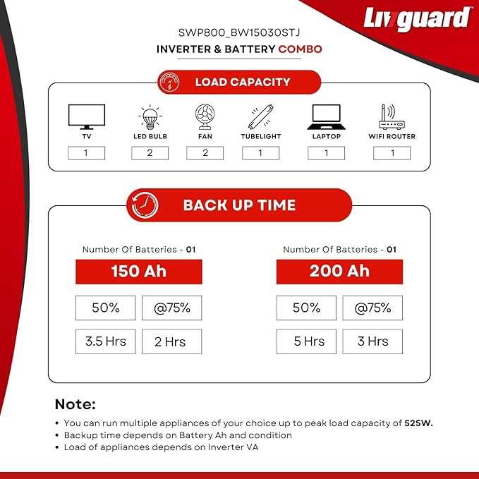 - Inverter Details- Type: Sine wave inverter, VA Rating: 700 VA/12V Peak Load : 525W | Running Load: Ceiling Fan, LED Bulb,LED Tube Light, Room Cooler, Laptop/ Computer, Wifi Router, Fridge |Inverter Compatibility: Designed for all types of power cut situations with Smart AI charging, low maintenance and Dual Mode Support (UPS and ECO) ensuring safety of sensitive appliances The 4-mode selector switch enables compatibility with a wide range of Batteries Like Flat Plate, Tubular, SMF and LOCAL