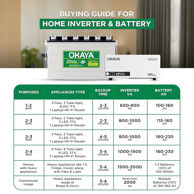 Okaya Inverter with Battery Combo for Home,Office & Shops|ATSW950 12V Pure Sine Wave Inverter 700VA with OPSJT19060 160Ah Inverter Battery