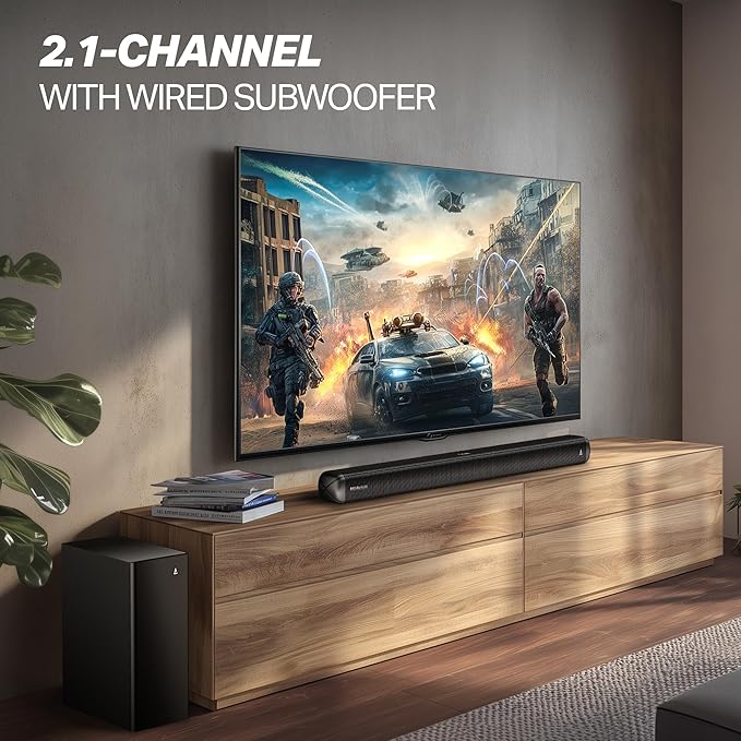 - 2.1 Channel with Wired Subwoofer: This soundbar comes with a wired subwoofer for a heightened relaxation while unwinding to your favorite content.